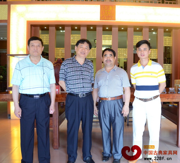 全國(guó)工商聯(lián)民間文物藝術(shù)品商會(huì)會(huì)長(zhǎng)宋建文(右二)與全國(guó)工商聯(lián)民間文物藝術(shù)品商會(huì)秘書長(zhǎng)肖秉俠(左二)等在仔細(xì)觀賞鴻庭軒展廳內(nèi)的精品家具