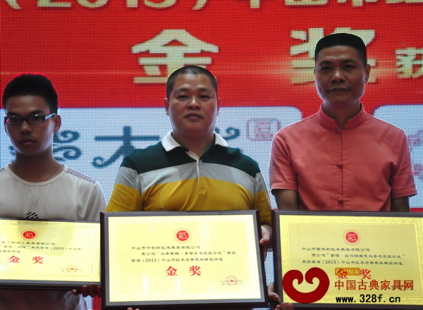 紫木軒總經(jīng)理王光輝(右)上臺(tái)接受中山市紅木古典家具精品金獎(jiǎng)獎(jiǎng)牌