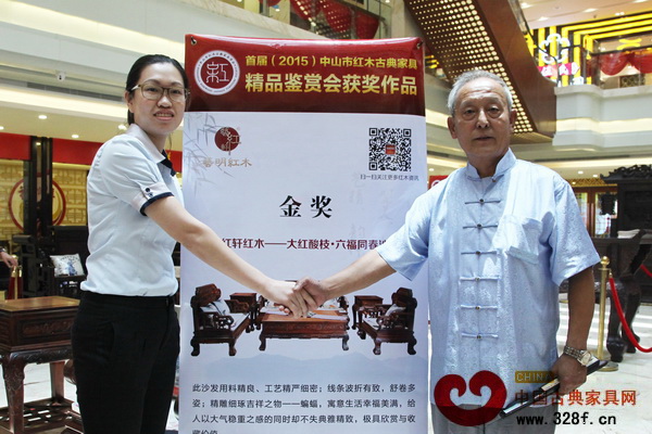 藝紅軒紅木《大紅酸枝六福同春沙發(fā)》榮獲中山市紅木古典家具精品“金獎”(右二為藝紅軒紅木總經(jīng)理梁影葉上臺領(lǐng)獎)