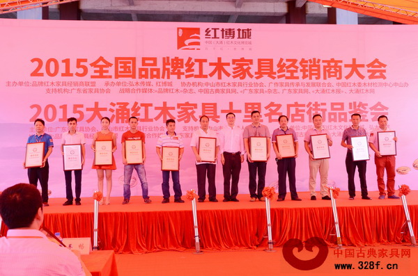 廣東省家具協(xié)會會長王克(右六)為天工雋品(左四)頒發(fā)“2015大涌紅木十里名店街品鑒會推薦名企”牌匾