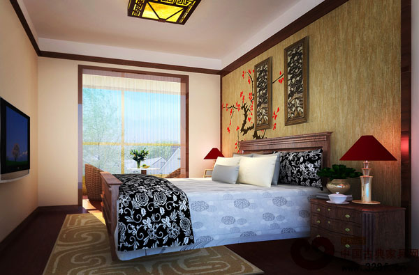 臥室背景墻是手繪的臘梅花,寓意業(yè)主在生活中喜笑顏開。