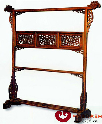 衣架是用來搭披衣衫的架子,多放在家內(nèi)床榻的一側(cè),有記載講到有素衣架和花衣架兩種,外間較為少見。當(dāng)時的衣架與現(xiàn)在的衣架不同?,F(xiàn)代衣架大多采用掛鉤式或枝叉式,衣物多以脖領(lǐng)處掛在衣鉤上。古人衣架,包括清代衣架,多采用橫桿形式,兩側(cè)有立柱,上下承木墩底座,兩座之間有橫板或橫棖,立柱頂端安橫梁,兩端長出立柱,盡端雕出龍鳳紋或靈芝或云頭之類。橫桿之下安中牌子,上有透雕裝飾,主要起牢固作用。衣服脫下后就搭在橫桿之上。另外還有一種巾架,結(jié)構(gòu)與衣架基本相同,只是長度較短,且多與盆架組合,但如放在室內(nèi),也可掛衣服,可稱為單人衣架。