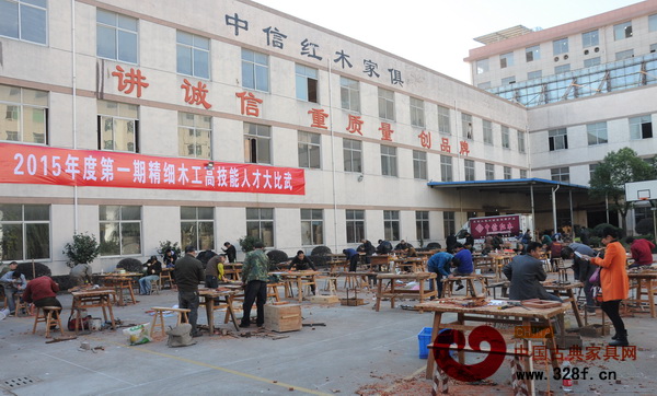 11月26日,浙江東陽市2015年度精細(xì)木工高技能人才大比武活動在浙江中信紅木家具有限公司(以下簡稱中信紅木)廠區(qū)內(nèi)舉行,來自東陽市各紅木家具企業(yè)的50多名木工人才聚集在中信紅木,展示純手工技藝。