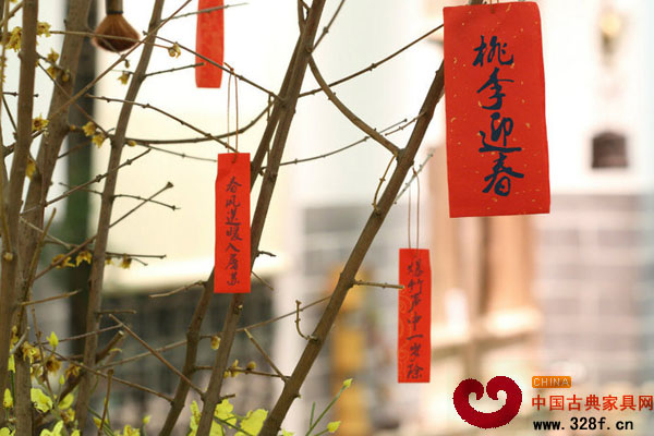 換新符:桃木是一種很玄乎的植物,深宅院落不宜栽種桃樹,又有道士打造桃木劍斬獲山精野鬼。古時候,人們在桃木上畫上神荼、郁壘二神,除夕當夜或于正月初一以新?lián)Q舊,保證來年的小人不入,驅(qū)鬼壓邪,祈福納祥。后來,這一習(xí)俗逐漸演變成桃木上的吉祥話,再變成如今的紅紙春聯(lián)。
