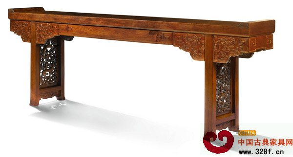 此案長逾三米,黃花梨制,案面為一塊未經(jīng)裁切的獨板,紋理致密細膩,瑩潔如玉,兩端裝翹頭,邊抹冰盤沿中部凹進,至底壓一道線。夾頭榫結(jié)構(gòu),牙條光素,沿邊起線,僅在牙頭鎪雕旋卷花紋。腿足方材,為外撇香爐腿的造法。前后腿足間置管腳棖,棖上擋板透雕“螭虎鬧靈芝”圖案,螭虎尾部為卷草型,頭、爪吸取了走獸的形象,身軀亦不刻鱗甲,曲線靈動飽滿,雕工玲瓏剔透,圖案精美,熨帖成章。此紋飾在明代中、晚期的瓷器、雕漆中也很流行。此案造型宏偉典雅,用料奢華,結(jié)構(gòu)標準嚴謹,或為特殊定制的明式家具精品。
