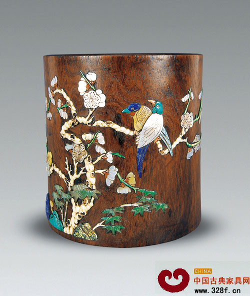 木筆筒以黃花梨、紫檀、沉香木等為貴(圖為清 黃花梨嵌八寶花鳥(niǎo)筆筒)