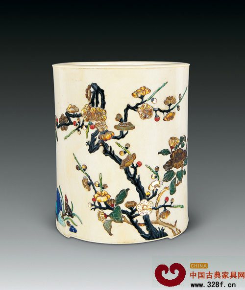 清時(shí)期,受清式家具裝飾風(fēng)格影響,筆筒的裝飾也異常華麗繁復(fù)(圖為清 象牙雕嵌八寶花卉紋筆筒)