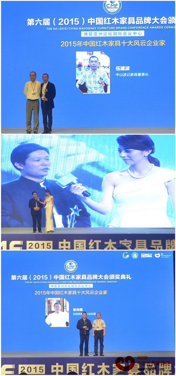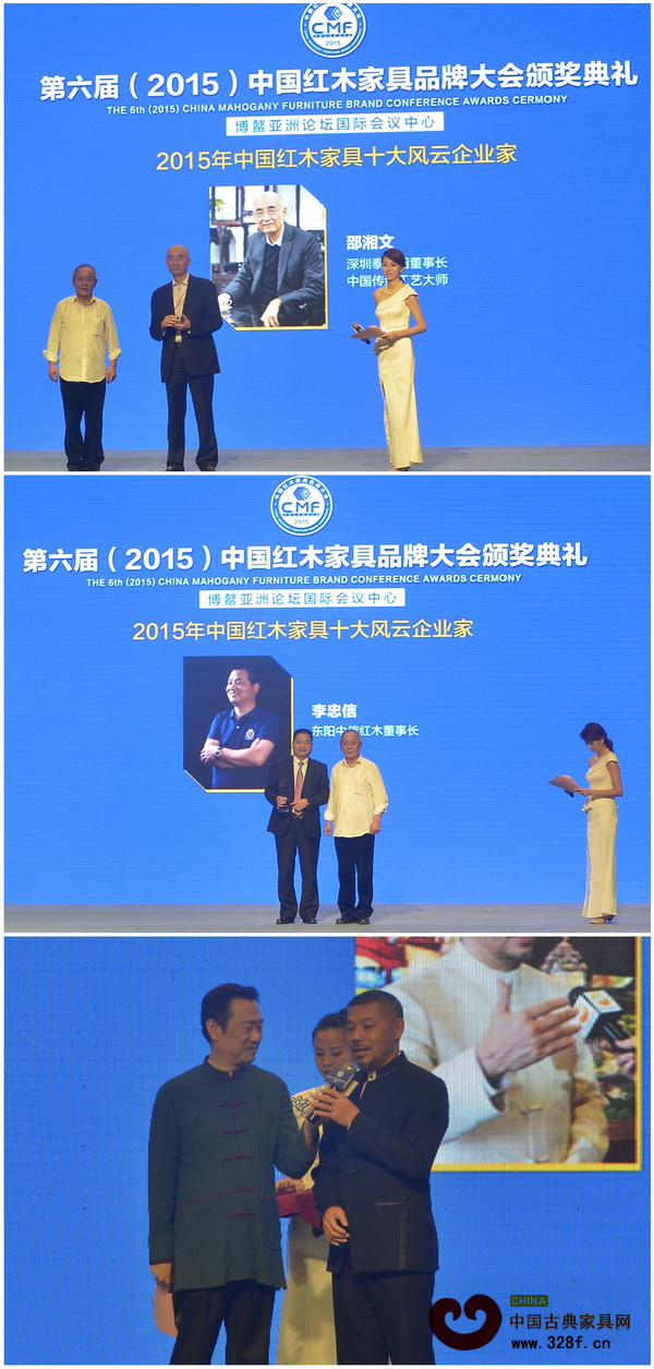 “2015年中國紅木家具十大風(fēng)云企業(yè)家”獲獎(jiǎng)個(gè)人上臺(tái)接受頒獎(jiǎng),從上至下依次為泰和園邵湘文、中信紅木李忠信、中山紅博城林孟禮、波記家具伍建波、東成紅木張錫復(fù)、明堂紅木張向榮、戴為紅木戴愛國、御乾堂馬海軍、紅古軒吳赤宇(代)與永華紅木陳達(dá)強(qiáng)(代)