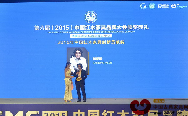 戴為紅木總裁戴愛國(右)榮獲“2015年中國紅木家具傳承貢獻(xiàn)獎(jiǎng)”