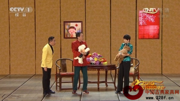 2016央視猴年春晚的第1個語言節(jié)目《快樂老爸》中紅木圈椅與紅木圓臺在熒幕上精彩亮相