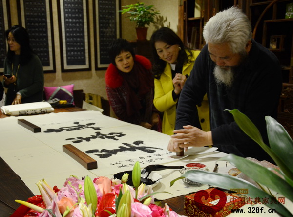 紅木家具與書法在藝術(shù)構(gòu)思與審美情趣上最為相通。 紅木家具的線條之美與書法藝術(shù)的線條之美更有著異曲同工之妙。紅木搭配名家書法,傳統(tǒng)文化更能雙珠輝映!現(xiàn)場(chǎng)嘉賓們?cè)诳走B紅木欣賞了一場(chǎng)紅木與書法的視覺盛宴,并紛紛向羅翰老師索求墨寶,為人謙虛的羅翰老師,不吝賜寶,現(xiàn)場(chǎng)為大家獻(xiàn)上書法作品,下筆如有神。作品之精妙得到了到場(chǎng)嘉賓的一致好評(píng),原本定于上午12點(diǎn)結(jié)束的活動(dòng)延續(xù)到了下午17點(diǎn)才正式結(jié)束?;顒?dòng)當(dāng)天更有很多小朋友來到現(xiàn)場(chǎng)感受紅木文化與書法文化的藝術(shù)熏陶。
