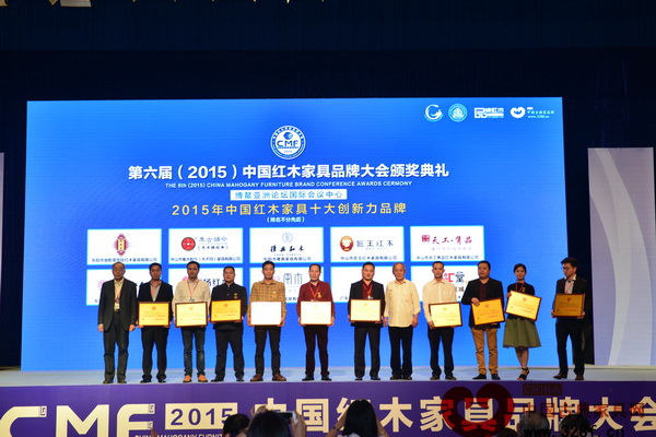 天工雋品憑借雄厚的實(shí)力喜獲“2015年中國(guó)紅木家具十大創(chuàng)新力品牌”,董事長(zhǎng)林子昌(右四)上臺(tái)接受頒牌