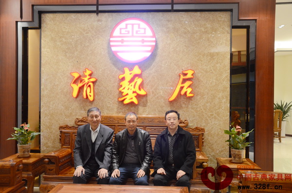 原故宮博物院文??萍疾恐魅尾莒o樓(左)、華南林業(yè)大學(xué)博士生導(dǎo)師李凱夫(右)與清藝居董事長(zhǎng)李裕青(中)在清藝居紅博城旗艦店內(nèi)合影