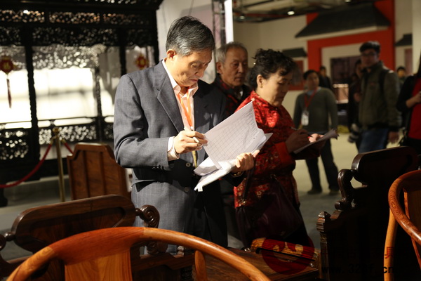 專家評審組在對《大紅酸枝·洋花寶座》進行現(xiàn)場評分