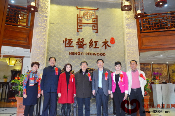 恒藝紅木總經(jīng)理黃玉芳(左一)與藝術(shù)聯(lián)展受邀領(lǐng)導(dǎo)在恒藝紅木體驗(yàn)館內(nèi)合影留念