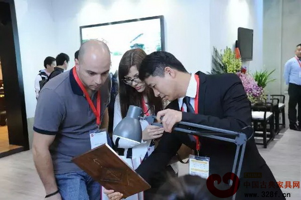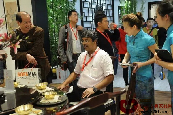 永華紅木的經(jīng)典產(chǎn)品《福祿餐臺》吸引了外國友人試坐體驗
