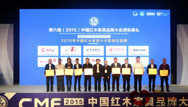 戴為紅木蟬聯(lián)“2015年中國紅木家具十大影響力品牌”稱號,戴為紅木總經理翁肖尤(左三)上臺接受頒牌