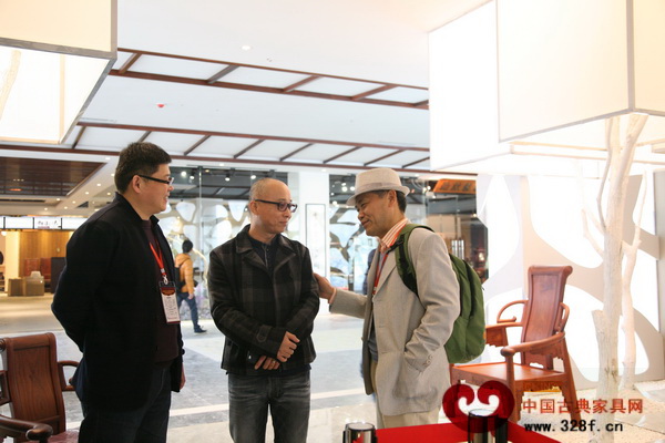 合興奇典居總裁蕭廣鐸、家具與室內(nèi)裝飾執(zhí)行主編王周在展會上溝通交流