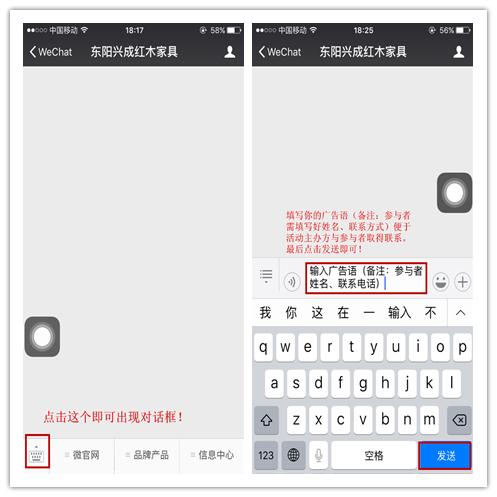 流程2:進(jìn)入東陽(yáng)興成紅木家具公眾微信號(hào),回復(fù)您的廣告作品