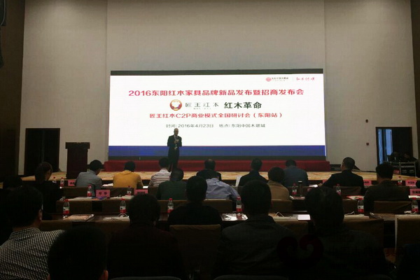 其中,由東陽市人民政府、東陽市紅木家具行業(yè)協(xié)會、品牌紅木家具經(jīng)銷商聯(lián)盟主辦,東陽中國木雕城、弘木傳媒協(xié)辦的“2016東陽紅木家具品牌新品發(fā)布暨招商發(fā)布會”(以下簡稱東陽發(fā)布會)是東陽紅博會的重要系列活動之一。在本次東陽發(fā)布會上,有一家企業(yè)格外引人注目:它在三月中山紅博會舉行的“2016中國紅木家具招商加盟大會上”上,正式推出紅木C2P模式,引起廣泛關(guān)注,并在短短一個月內(nèi)成為紅木家具行業(yè)熱議的話題;四月,它再次出征東陽紅博會,引發(fā)一場“紅木革命”,席卷這場展會,它就是北京市匠王紅木技術(shù)研究院監(jiān)制的“匠王紅木”。