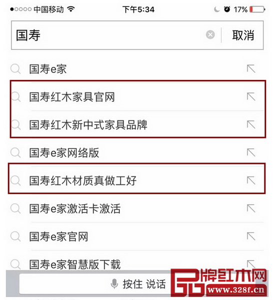 搜索“國(guó)壽”、“國(guó)壽紅木”關(guān)鍵詞,下拉框也會(huì)智能匹配大部分搜索者想了解的內(nèi)容:“國(guó)壽紅木材質(zhì)做工好”、“國(guó)壽紅木新中式家具品牌”、“國(guó)壽紅木家具怎么樣”、“緬甸花梨知名品牌國(guó)壽紅木”