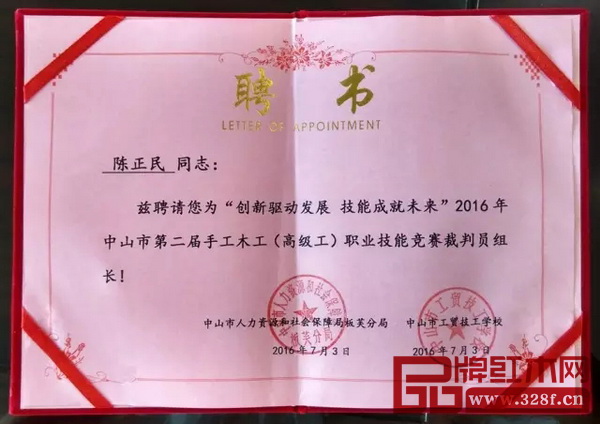[摘要]中山市集古韻今(大不同)家具有限公司總經(jīng)理陳新平、技術(shù)總監(jiān)陳正民大師與中山市人力資源與社會(huì)保障局陳謙科長(zhǎng)等領(lǐng)導(dǎo)一同出席中山市第二屆手工木工(高級(jí)工)職業(yè)技能競(jìng)賽并擔(dān)任競(jìng)賽裁判員。