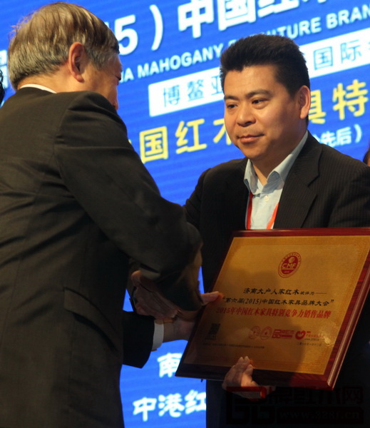大戶人家董事長(zhǎng)周世建接過2015年中國(guó)紅木家具特別競(jìng)爭(zhēng)力銷售品牌獎(jiǎng)牌