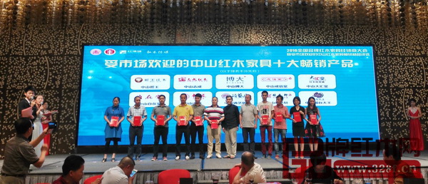 匠王紅木《黑酸枝·如意人生沙發(fā)》榮獲“ 受市場歡迎的中山紅木家具十大暢銷產品”大獎,匠王紅木董事長李茂先(左六) 上臺接受證書