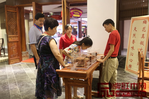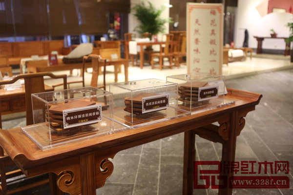 一進(jìn)展廳大門,一股香氣撲鼻而來,這正是真正的緬甸花梨木的味道,為了加強(qiáng)對(duì)比,南枝紅紅木特意在進(jìn)門處設(shè)置了納米環(huán)保涂裝、傳統(tǒng)抹蠟涂裝以及緬花原木的玻璃箱供經(jīng)銷商聞香,真實(shí)體驗(yàn)他們之間的區(qū)別,聞過之后會(huì)發(fā)現(xiàn)使用環(huán)保涂裝后木塊香氣的釋放程度與原木無涂裝的香氣等同一致。
