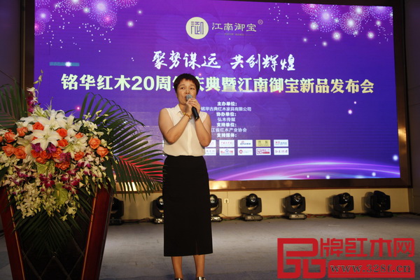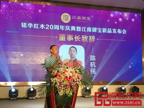 “江南御品”新品發(fā)布會上,銘華紅木董事長陳杭民上臺致辭