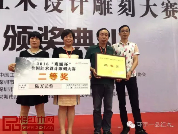 環(huán)宇一品紅木(左二)榮獲2016“觀瀾杯”全國(guó)紅木設(shè)計(jì)雕刻大賽二等獎(jiǎng)