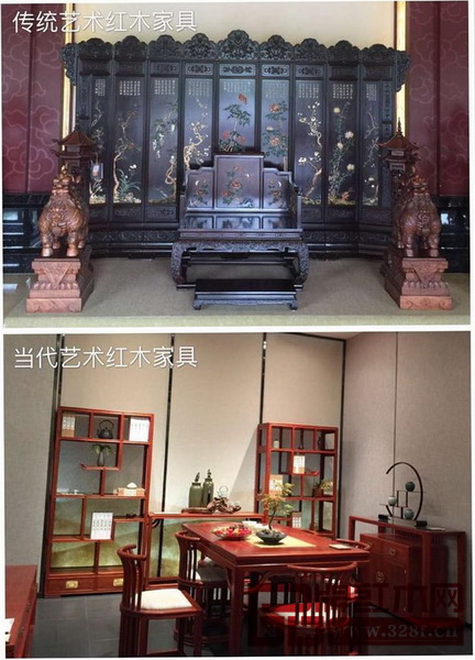 上圖:區(qū)氏臻品傳統(tǒng)藝術(shù)紅木家具 下圖:國壽紅木當(dāng)代藝術(shù)紅木家具