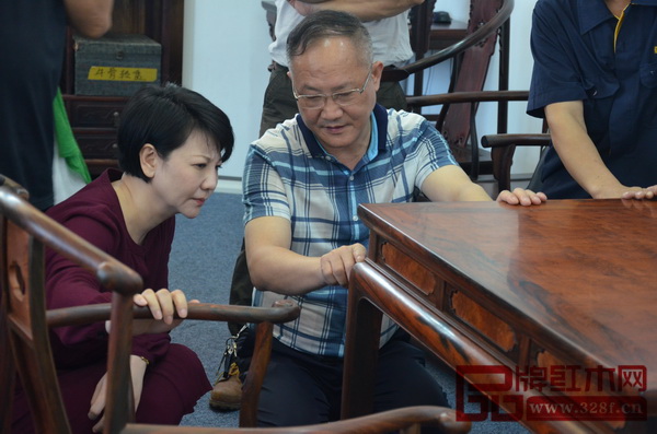 中國傳統(tǒng)工藝大師、魯班木藝董事長李愛金(右)與資深紅木人士劉天舒(左)現(xiàn)場針對產(chǎn)品的榫卯工藝進(jìn)行了探討