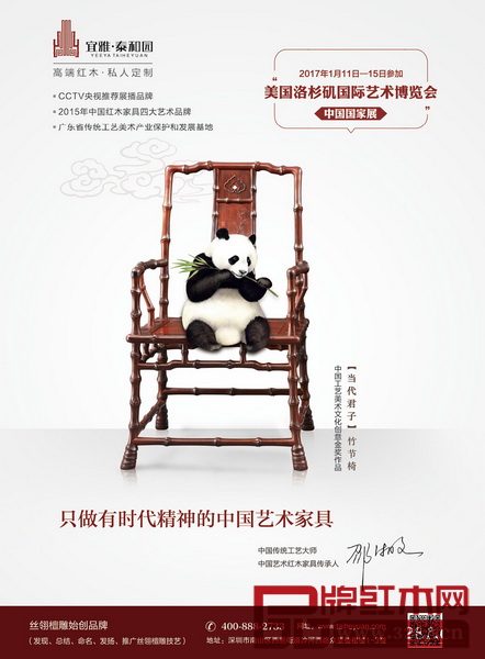 2017年1月,泰和園將代表紅木類(lèi)中國(guó)傳統(tǒng)工藝大師走向美國(guó)洛杉磯藝術(shù)博覽會(huì)中國(guó)國(guó)家展,展示國(guó)粹文化,讓世界愛(ài)上中國(guó)紅木家具,大力推進(jìn)紅木產(chǎn)業(yè)的發(fā)展。