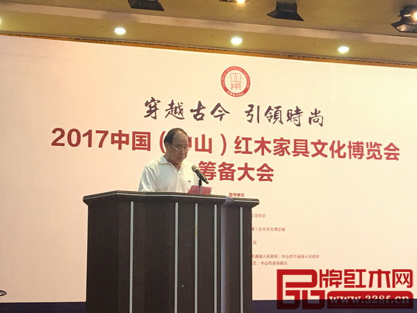中山市紅木家具行業(yè)協(xié)會會長、鴻發(fā)家具董事長蕭照興在籌備大會上致辭,號召企業(yè)積極參與盛會