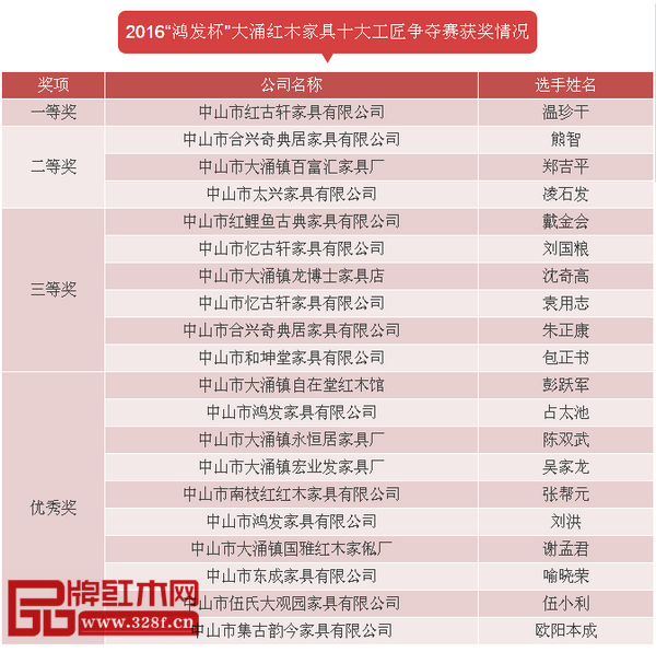 2016“鴻發(fā)杯”大涌紅木家具十大工匠爭奪賽獲獎名單