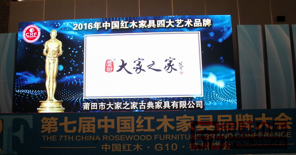 1月4日,由全國工商聯(lián)民間文物藝術(shù)品商會、全聯(lián)藝術(shù)紅木家具專委會主辦,品牌紅木全媒體承辦的第七屆中國紅木家具品牌大會(以下簡稱品牌大會)在杭州G20峰會舉辦地隆重舉行。大會包括了2016年中國紅木家具行業(yè)總評榜頒獎典禮、中國紅木G10領(lǐng)袖峰會暨第七屆中國紅木家具品牌論壇、全聯(lián)藝術(shù)紅木家具專委會年會等具有重要意義的活動。全國紅木家具行業(yè)領(lǐng)導、產(chǎn)區(qū)領(lǐng)導、權(quán)威專家與業(yè)界精英將共聚一堂,共享紅木盛會。莆田市大家之家古典家具有限公司(以下簡稱大家之家)再度譜寫輝煌篇章,獲“2016年中國紅木家具四大藝術(shù)品牌”。