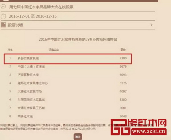 在2016紅木總評(píng)榜投票中,新會(huì)古典家具城以7390票的高人氣領(lǐng)先網(wǎng)絡(luò)排名榜