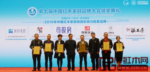 瑞昇家居榮獲2016年中國紅木家具特具影響力軟裝品牌”大獎,總經(jīng)理饒穎(左三)上臺領(lǐng)獎