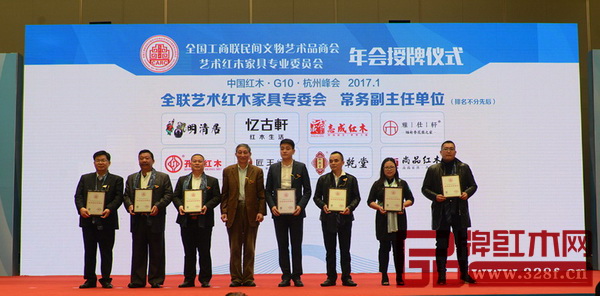 尚品紅木當選全聯(lián)藝術紅木家具專委會常務副主任單位,董事長戴惠東(左一)上臺接受授牌