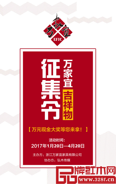 浙江萬家宜家具有限公司隸屬于萬家宜控股集團旗下,經(jīng)過近20年的發(fā)展,目前已發(fā)展成為產(chǎn)業(yè)基地浙江東陽極具影響力的品牌企業(yè),曾先后榮獲“中國紅木家具十大受歡迎品牌”、“浙江名牌產(chǎn)品”、“浙江著名商標”、“浙江林業(yè)重點龍頭企業(yè)”“東陽市木雕·紅木家具龍頭骨干企業(yè)”等殊榮。隨著公司的日益壯大和企業(yè)發(fā)展的需求,現(xiàn)面向社會公開征集吉祥物。