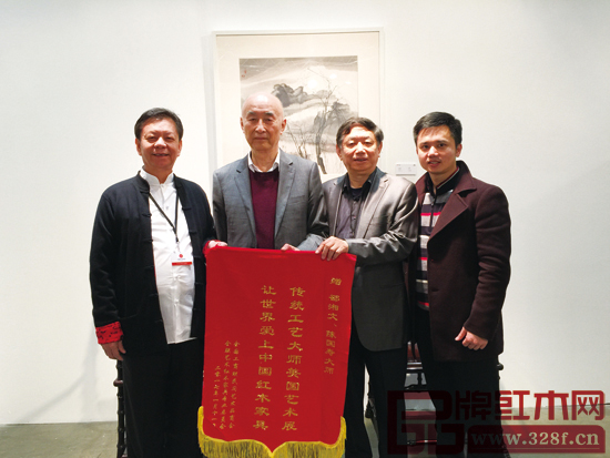 全國工商聯(lián)執(zhí)委、全聯(lián)民間文物藝術(shù)品商會會長宋建文(右二),全聯(lián)藝術(shù)紅木家具專委會執(zhí)行會長林偉華(右一)為兩位中國傳統(tǒng)工藝大師陳國壽(左一)、邵湘文(左二)贈送紀(jì)念錦旗