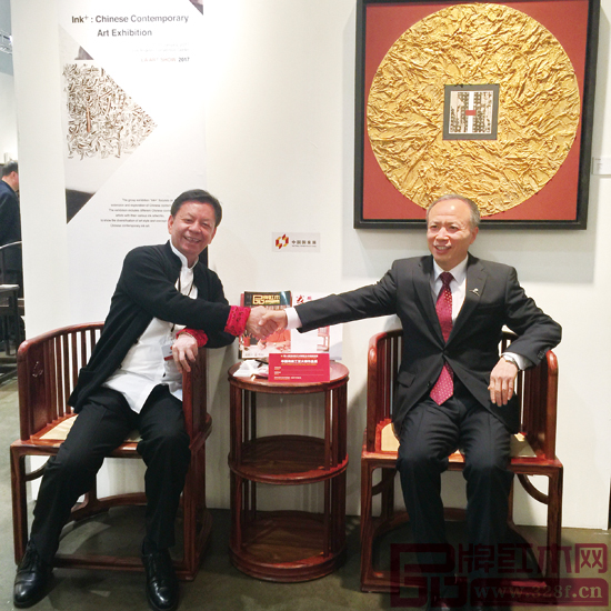 中國駐洛杉磯總領(lǐng)館文化參贊古今(右)與中國傳統(tǒng)工藝大師陳國壽(左)坐于國壽椅合影留念