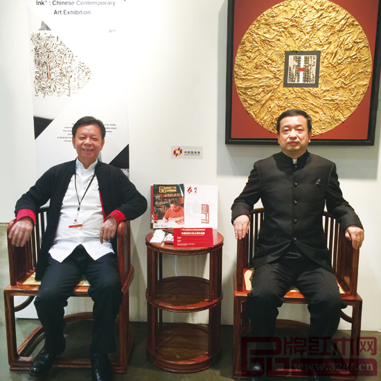中國文化傳媒集團(tuán)副董事長宋合意(右一)與中國傳統(tǒng)工藝大師、國壽紅木董事長陳國壽 (左一)坐于國壽椅合影留念