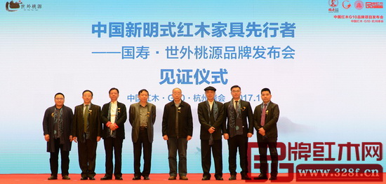全聯(lián)民間文物藝術(shù)品商會會長宋建文(左四)、中國紅木家具文化研究院院長濮安國(右三)、中國紅木家具技術(shù)專家曹新民(右四)、華南農(nóng)業(yè)大學(xué)博士生導(dǎo)師李凱夫(左二)、東北林業(yè)大學(xué)明清家具研究所所長牛曉霆(左一)、國壽紅木董事長陳國壽(左三)、國壽紅木副董事長陳淦凡(右二)、杭州國壽·世外桃源旗艦店總經(jīng)理江小祥上臺共同見證國壽·世外桃源品牌發(fā)布會的啟動