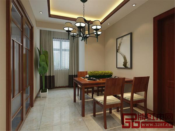 餐桌選為4人餐桌,簡(jiǎn)單大方。餐廳的吊頂為圓形吊頂,帶有燈帶,因餐廳背景墻較空,所以做了簡(jiǎn)易的隔板,可以放些書籍盆栽等