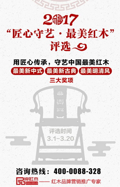 什么樣的紅木家具才是精品?2017年什么樣的品牌最值得加盟?由全聯(lián)藝術(shù)紅木家具專業(yè)委員會(huì)主辦,弘木傳媒承辦的展會(huì)系列活動(dòng)——2017“匠心守藝·最美紅木”評選將為您解答!