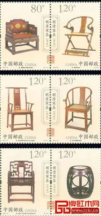 中國(guó)郵政于2011年6月20日發(fā)行《明清家具——坐具》特種郵票1套6枚。郵票主圖選用寶座、交椅、官帽椅、圈椅、扶手椅、鼓凳作為表現(xiàn)對(duì)象,這些文物的質(zhì)地分別是紫檀和黃花梨,部分結(jié)合使用了大理石材質(zhì),色彩高貴莊重,典雅大方,由于年代久遠(yuǎn),這些文物的表面形成了自然的包漿,在光線的照射下顯得熠熠生輝。郵票采用白色作為底色,將家具本身的光彩原汁原味地完美呈現(xiàn);三邊無(wú)框的郵票設(shè)計(jì)方式,留給讀者更多的遐想。郵票真實(shí)地再現(xiàn)了這些家具材質(zhì)美麗的原色和包漿的光澤,令人感到目不暇接,嘆為觀止,驚嘆于中國(guó)古代藝術(shù)的高超。