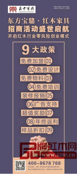 東方寶鼎一直以來都非常重視對經(jīng)銷商的扶持力度,全方位考慮經(jīng)銷商利益。在即將到來的國際名家具展中,東方寶鼎將對符合標(biāo)準(zhǔn)的加盟經(jīng)銷商給予政策支持和加盟優(yōu)惠,繼續(xù)啟動紅木家具行業(yè)“零風(fēng)險”創(chuàng)業(yè)模式的“九大招商政策”:免費加盟+免費設(shè)計+免費物料+免費培訓(xùn)+裝修報銷+廣告支持+超值獎勵+年終返利+樣品折扣。