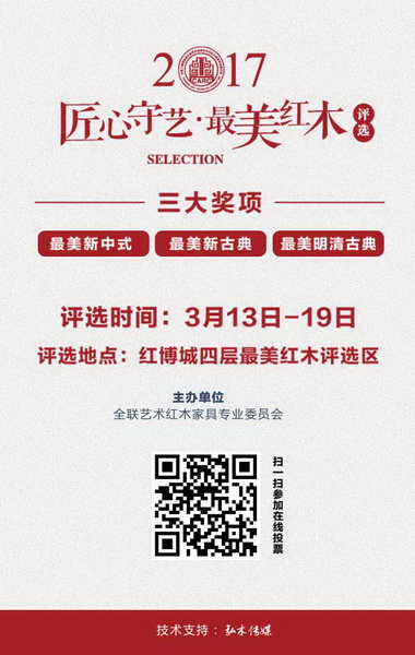 3月13日下午,由組委會(huì)與設(shè)計(jì)師、工藝師、紅木行業(yè)協(xié)會(huì)等聯(lián)合舉辦的2017“匠心守藝·最美紅木”評(píng)選現(xiàn)場(chǎng)將進(jìn)行專家顧問(wèn)現(xiàn)場(chǎng)評(píng)點(diǎn)、評(píng)分。3月13日—19日紅博會(huì)期間,消費(fèi)者可通過(guò)添加“全聯(lián)藝術(shù)紅木家具專委會(huì)”、“品牌紅木”官方微信進(jìn)入專題頁(yè)面,或掃描現(xiàn)場(chǎng)的二維碼投票,投票成功即可獲得精美小禮品一份。“最美新中式”“最美新古典”“最美明清風(fēng)”等您鑒賞。